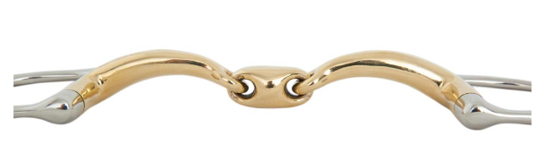 The double jointed bit consists of three parts. The middle section of the mouthpiece lies flat on the tongue, this causes more pressure on the tongue than a single jointed bit. The thicker the middle section, the more pressure it will create on the tongue.