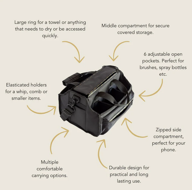 This spacious caddy offers ample room and customisable compartments, ensuring every brush, spray bottle, and comb has a designated spot – perfect for competitions, grooming at home or general storage. Thoughtfully designed, it features elasticated whip holders and a ring for hanging spurs, bits, or towels, keeping items dry and within reach.