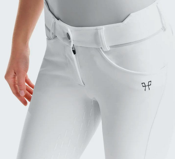 The fabric is particularly hardwearing, pleasant to the touch and easy to care for. With its practical cut and pre-shaped legs, it is like a second skin, giving maximum freedom of movement when riding. The inner leg seam has been removed to reduce friction. The entire seat is printed with our «Grip» technology and the high waist is designed to meet and cope with with the demands of the sport.